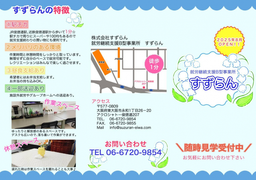 俊徳道駅から徒歩1分の好立地。通所できる方を大募集中。