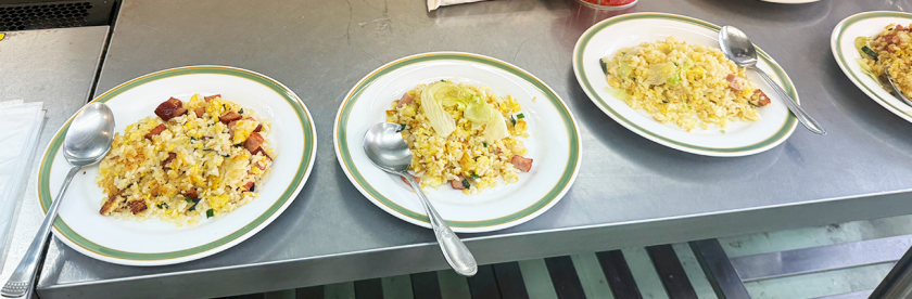 調理台にみなさんのチャーハンを並べて食べ比べしました。とても美味しかったです。