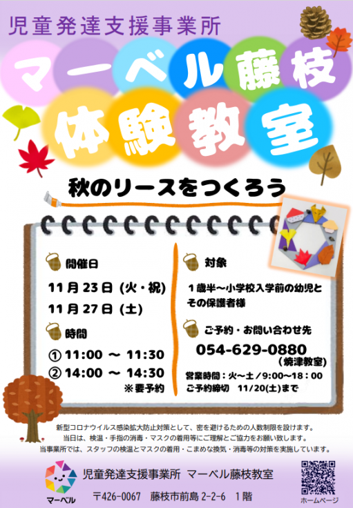 お子さま一人ひとりの発達状況や、保護者様の意向をうかがいながらオーダーメイドの支援計画をたて、マンツーマンを主とした療育を行います。また、藤枝教室では無料体験教室を行っております。11月の体験教室の日程は11/23(火)と27日(土)です。お気軽にご連絡ください。
