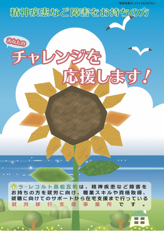 人は働くことを通じて、誰かに必要とされることで心が元気になり、もっと良い人生を送りたいという意欲が生まれ、人生がより豊かになっていくと感じています。【ラ・レコルト高松瓦町】では障害や疾患名だけで一括りにできない、一人ひとりの興味関心や強み弱みの理解につとめ、その方にあった目標やペースを共に考え、就職までの道のりと就職後の人生を継続的にサポートしていきたいと考えています。また「障害は社会の側にある」という考えを持ち、就労に向けたトレーニングはもちろん、地域や職場にも働きかけを行うことで、安心して活躍できる環境づくりにも努めております。