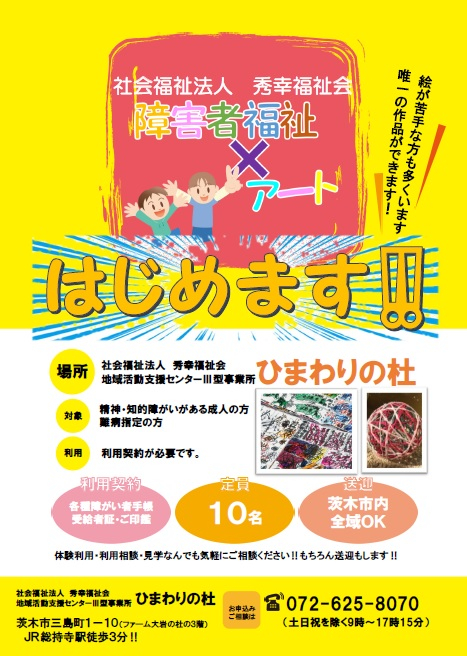 JR総持寺駅徒歩3分!家庭的な空間でゆったりと過ごせる、楽しいプログラム盛りだくさんの地域活動支援センターです!!ものづくり、絵画、アート作品に力を入れて、日中の居場所作りを支援しています。