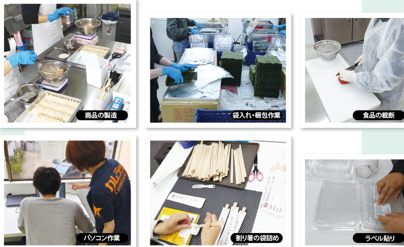 単純作業から調理系の作業、事務系(パソコン入力など)作業、デザイン業務(専属デザイナー在中) などなど