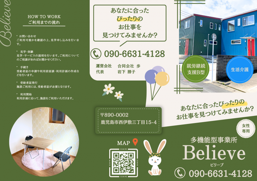 多機能型事業所Believeは鹿児島市にある女性向け就労継続支援B型(B型事業所)と生活介護を運営している施設になります。当事業所では利用者様と相談しながら、一緒に一人一人にあうお仕事を見つけていきます。
