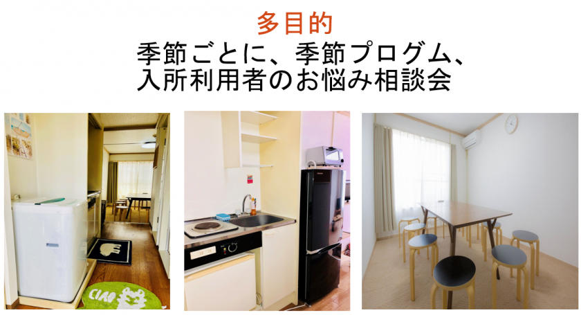 「将来一人暮らしがしたい」という希望に応えるために、一人暮らしの実体験を通して洗濯や掃 除、食事など、一人暮らしに必要な知識・習慣を身につけられる環境を提供します。 また通所しながらのトレーニングを通して、本格的に一人暮らしのスキルを身に付け、 将来仕事をしながら単身生活を送れるようになる事を目的としています