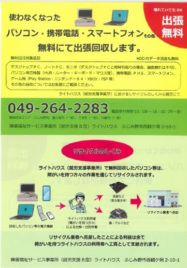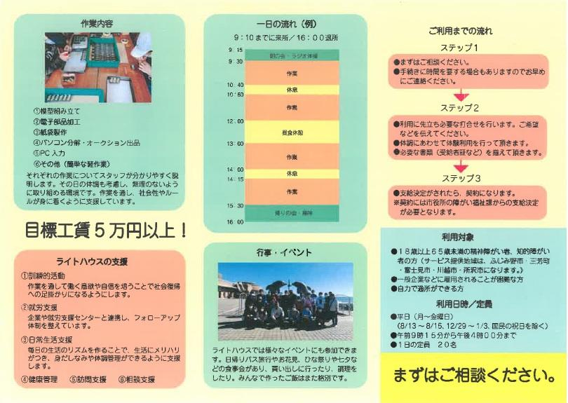 障がいのある方が地域生活をいきいきと送ることができるように、活動や支援を通して社会参加と自立を目指す施設です。目標工賃5万円以上を掲げ、内職や作業・訓練等を行い、社会性を養いながら自分らしく生活していけるよう一緒に歩んでいける施設を今後も目指していきます。