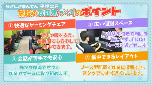 ゲームをクリアする喜び、ゲームのプレイ技術を磨けるやりがい、通所するための動機が自分の中から自然と湧き上がってきます。 何かあったときは、話しやすい、相談しやすい環境です。同じ目線で話を聞いてくれるので、メンタル面も安定してきます。 こんな人はお気軽にお問い合わせください★ ・ゲームが好きで、その好きなことを活かしたい方 ・引きこもっていて社会に少しずつ関わっていきたい ・人との会話に疲れやすいけど、黙々と作業するのは得意な方 ・毎日の通所で生活リズムを整えたい方 ・一般就労にはまだ抵抗があるけど、趣味からなら挑戦してみたい方 ・「まずは安心できる環境」で続けてみたい方 続きを見る