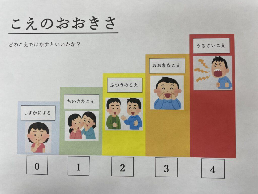 声の大きさは急に直せるものではありませんが,表を見て日々意識することで少しずつ改善ができます。場面にあった声で話せるよう療育活動をさせていただきます