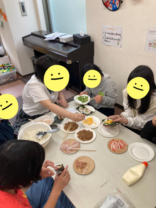 土曜日は、手巻き寿司作りを行いました。きゅうりや魚肉ソーセージを切り、炒り卵を作ったり挽肉を炒めたりと具材作りを行い、すし飯を作り、海苔の上に白米と具材をのせてくるくる巻いて完成です(*^^*)