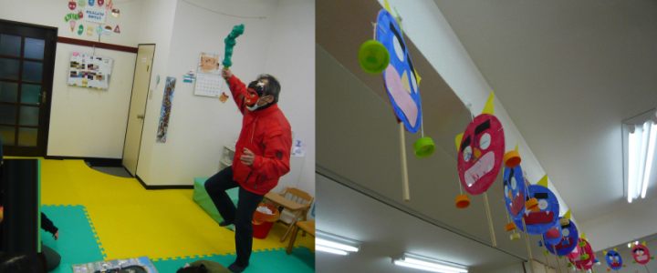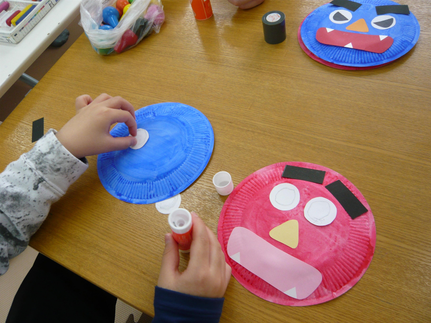 もうすぐ節分ですね。こわーいおにさんがアルクにも来るかも? 児童発達支援のお友だちと、赤鬼、青鬼のお面を作りました。こわーい鬼さんになるかと思ったら・・・ なんだか困ったお顔の鬼さんや、笑ったお顔のおにさんが出来上がりました^^ 節分の日には、イベントも考えているのでみんなで楽しもうね!