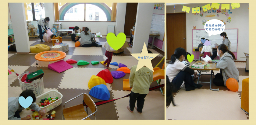 活動時間中は、大部屋の真ん中で個別リハビリをしている子がいたり、大部屋の隅の少し静かな場所で取り組んでいる子がいたり、そのすぐそばで遊んでいる子がいたりと様々です。大部屋から少し離れた個室で個別リハビリを行うこともあります。