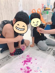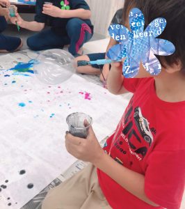 絵具を混ぜたシャボン玉液を大きな紙の上で吹いてみると、