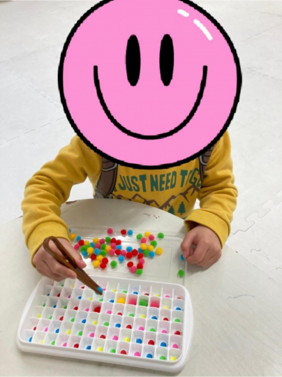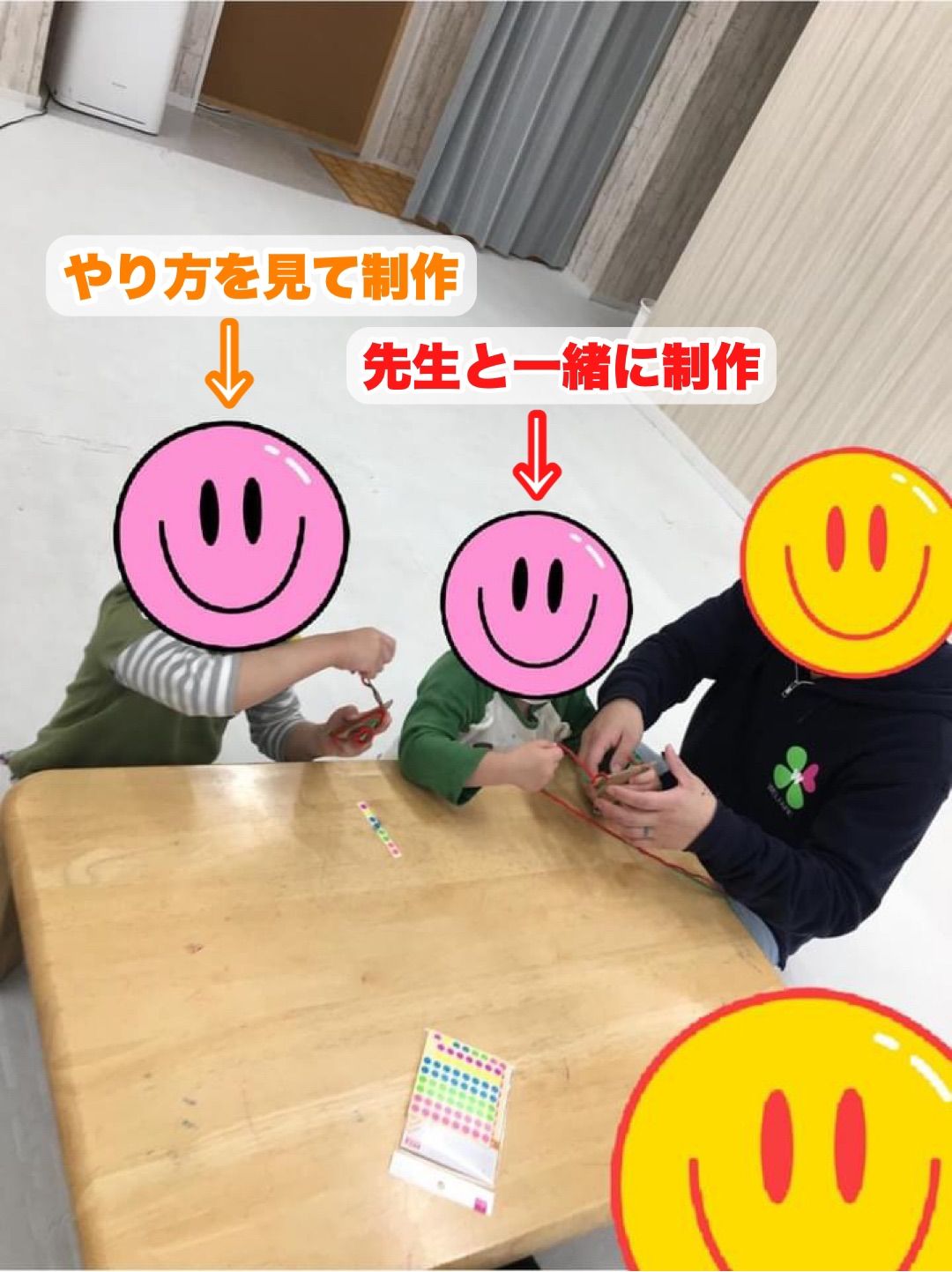 こちらは別日に制作を行った様子をお届けします!2人の男の子が制作していました!真ん中にいる男の子は、先生と一緒に行い、左側の男の子はその様子を見て1人で制作に挑戦!