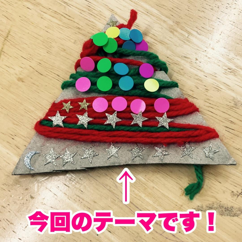 まずはこちら!クリスマスツリーが完成するまでの手順を紹介します!ダンボールを三角にカットし、その後に、赤と緑の毛糸を巻いていきます。(固定できるように合間に切り込みを入れてます)最後にシールを張ってデコレーションをして完成です!!