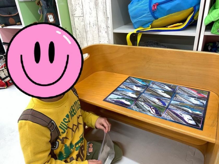 100ピースの新幹線パズルに挑戦していた男の子(^^♪もうすでに枠の部分が仕上がっています。なるほど、枠から組んでいくんですね。逆に勉強になります。