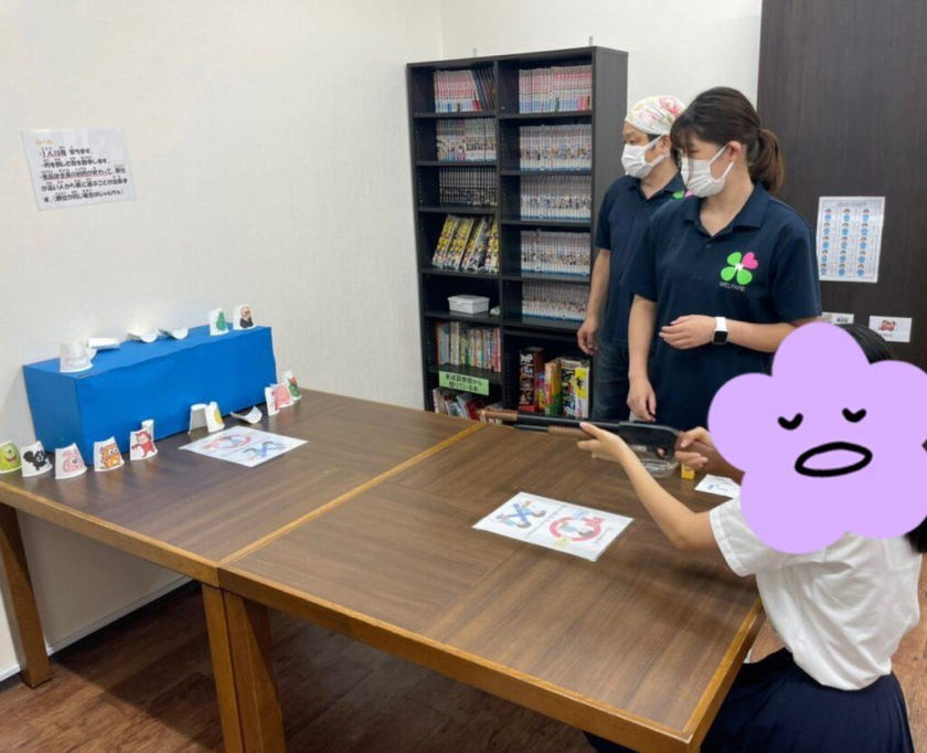 コルクガンを使って対象物を狙います。10発練習して本番10発撃ちました!本番で倒した数が多い子から景品を選んで頂きました♪景品はキーホルダー、靴下、カラーペンなどがあり、みんな好きな物を選んで持ち帰りました
