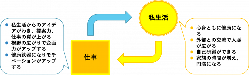 私生活が充実していると、人脈やスキル、アイデアなどが増え、それらが仕事の質や効率を高めることにつながるといった、相乗効果を生み出します。