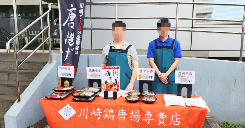 関連会社の「川崎鶏唐揚専賣店 川崎中幸店」のお弁当や唐揚げを、ランチタイムに合わせて指定の会社で外販します。