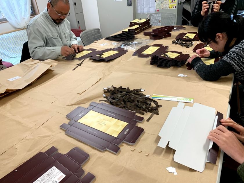 軽作業班は、今日もお菓子の箱にリボンをつけて折っています。