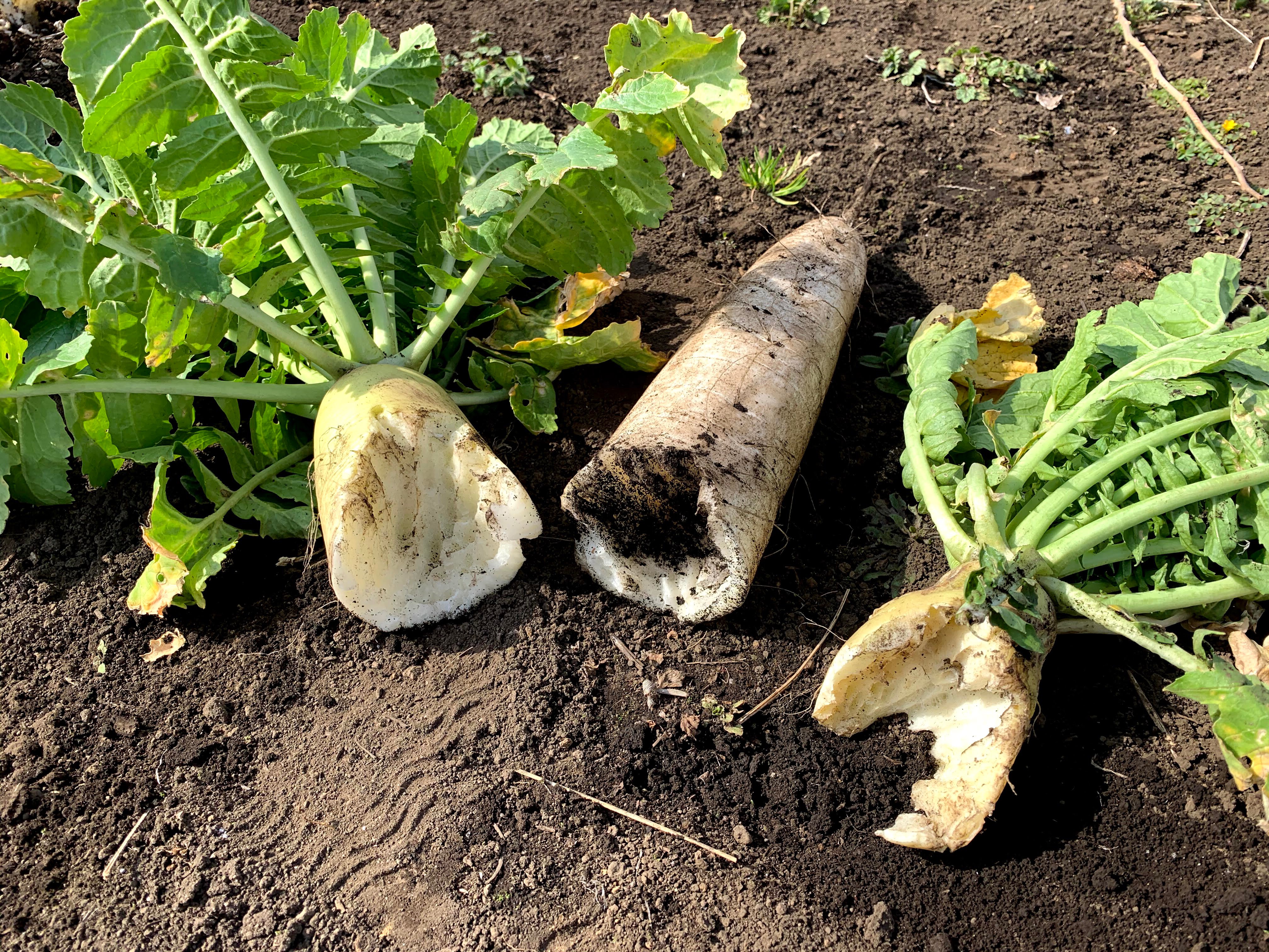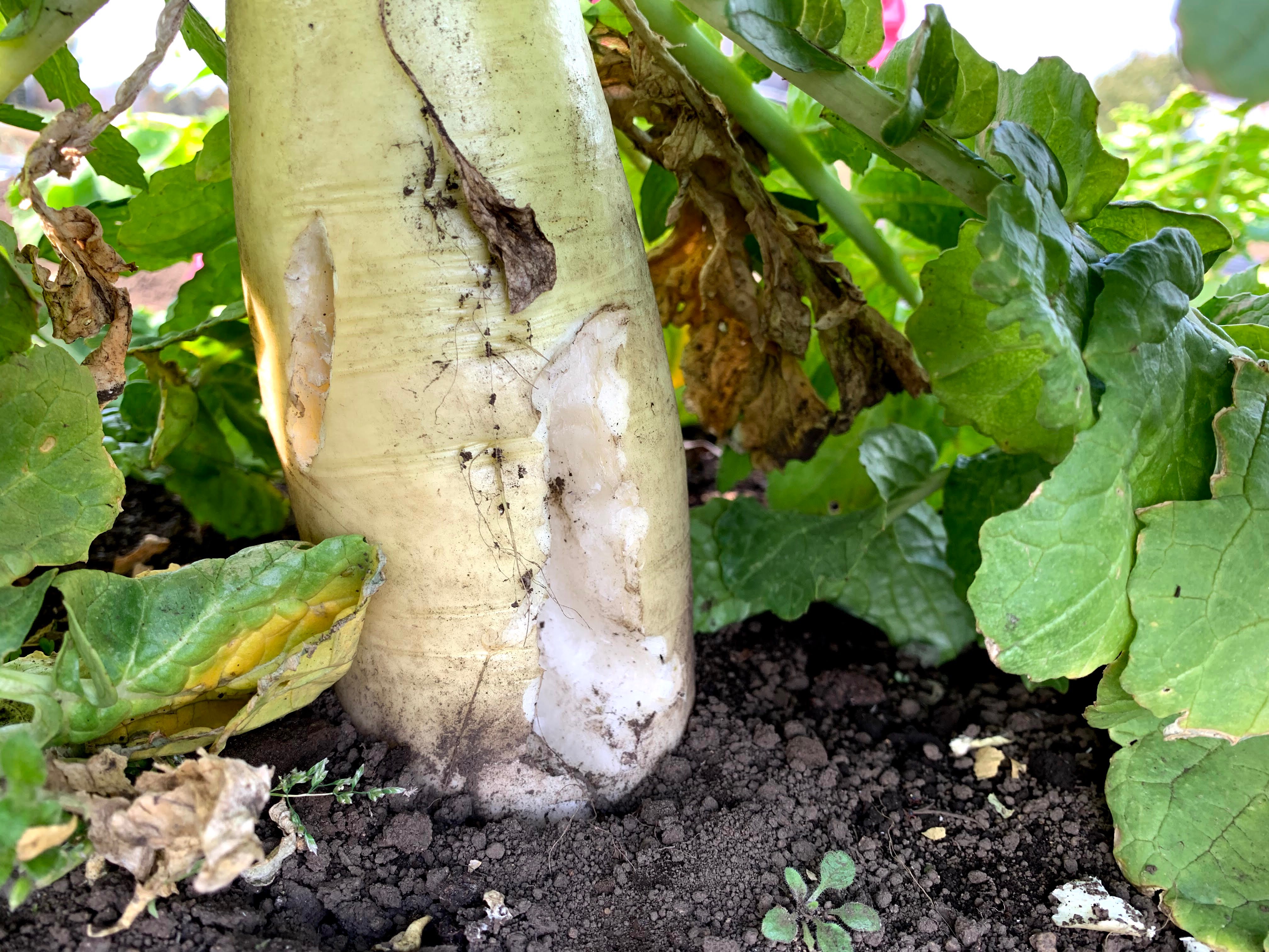 ニンジンとダイコンが、野生動物に食べられてしまっています。