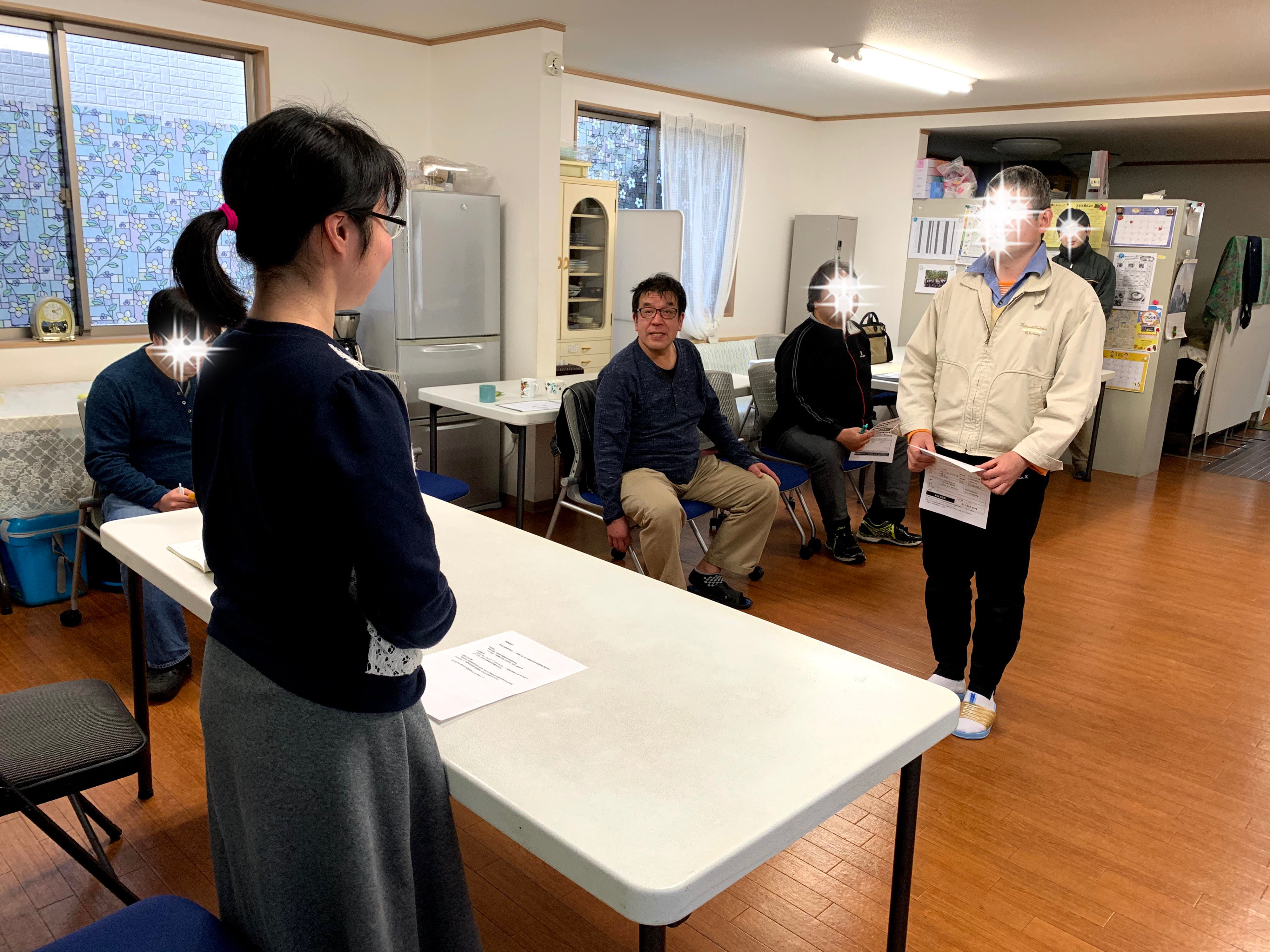 全員が社員役とお客さん役を交代で演じ、それに対して全員が意見を出し合います。