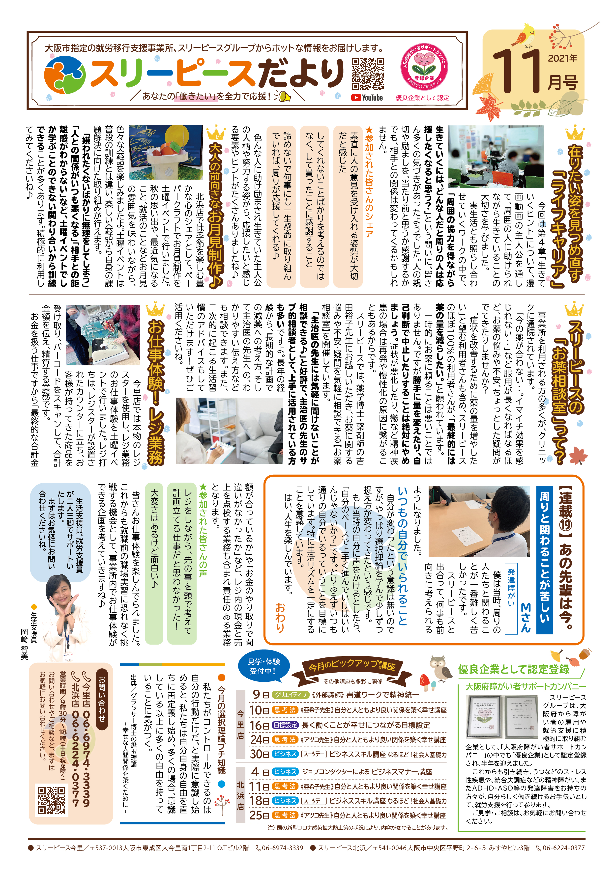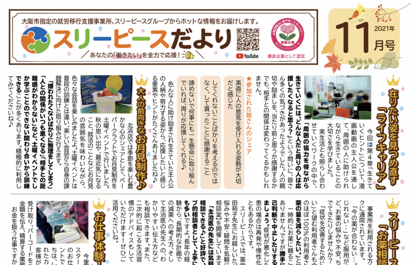 さてスリーピースグループでは、日々の訓練がどのように楽しく行われているかをダイジェストにご紹介する「スリーピースだより」を、利用者様や関係機関にお配りしています。