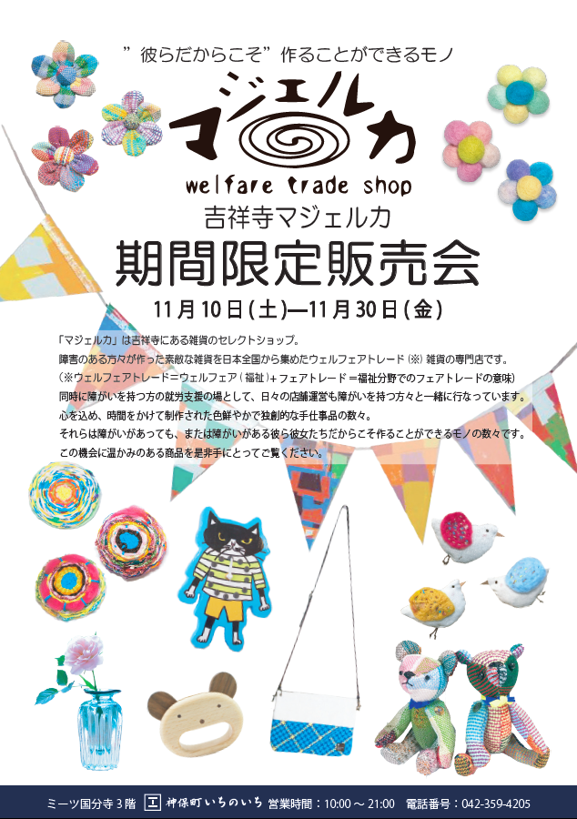 11/10から11/30まで、吉祥寺の雑貨のセレクトショップ「マジェルカ」の商品が、セレクトショップ、神保町いちのいち・ミーツ国分寺店販売されています。