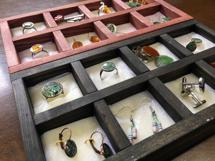 「都市鉱山スタイル」のアクセサリーはパソコンや家電製品から取り出された基板を用いて制作されています。基板は工業的な利便性から、無骨ながらに非常に機能的な造形をしており、機能美を追求した形であると言えます。そんな基板をパソコンから取り出して、アクセサリーという形に再加工するということはまさに、原石を採掘して宝石に加工する行為と言えるでしょう。