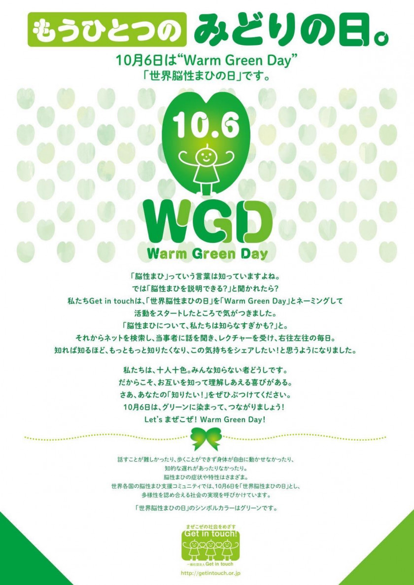 脳性まひって聞いたことはあるけど、よく知らない、そんな方が多いのではないでしょうか。世界各国の脳性まひ支援コミュニティでは、10年前の2012年から10月6日を「世界脳性まひの日」とし、発信しています。「まぜこぜの社会」の実現を目指し、数々の啓発イベントを開催してきた一般社団法人Get in touchは、4月2日の世界自閉症啓発デーに合わせて世界をブルーに染め上げた「Warm Blue Day」に続き、10月6日に「世界脳性まひの日」のシンボルカラーであるグリーンに街とSNSを染めようと「Warm Green Day(WGD)」を始めます。