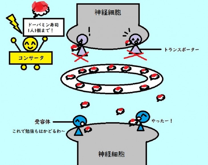 回転ずしを例にあげると、色々な種類のお寿司がまんべんなくコンベアーで回っている状態を、脳の働きが良い状態に置き換えます。しかし、お客さん(トランスポーター)が看板メニューであるドーパミン寿司ばかり食べ過ぎることで、コンベアーの上にドーパミン寿司がなくなってしまい、回転寿司としては活気がなくなってしまうのと似ています。