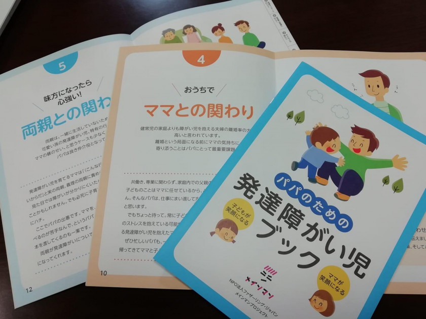 「お母さんというだけで頑張っているので、お母さんという言葉の呪縛に縛られないでほしいです。障害児の子育てで母親が孤立するのを防ぎたいという思いで、「パパのための発達障がい児ブック」を作成しました。両親の関わり方についてわかりやくまとめていて、役に立つ内容ですので、ぜひ手にとってもらいたいです。10冊3,000円(送料込)で購入できます。お問い合わせは、fjmainman@gmail.com までお願いします」