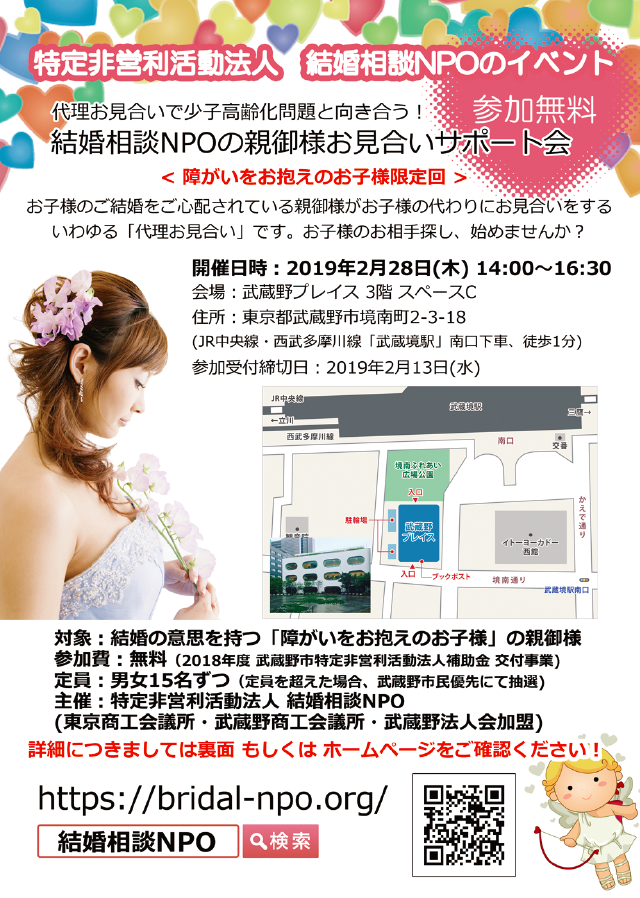 2019年2月28日、障害がある子の親の代理お見合い「結婚相談NPOの親御様お見合いサポート会」が、東京都武蔵野市で開催されます。この会を主催する結婚相談NPOは、少子高齢化問題の解消を目指し、2013年に設立されました。現在、吉祥寺サテライト、真鶴サテライトの2か所で結婚相談所「ブライダルサポーター」を運営されています。特に、神奈川県の真鶴サテライトは、周辺の結婚相談所の閉鎖が相次ぐ中、過疎解消に向け真鶴町と一緒に取り組んでいます。