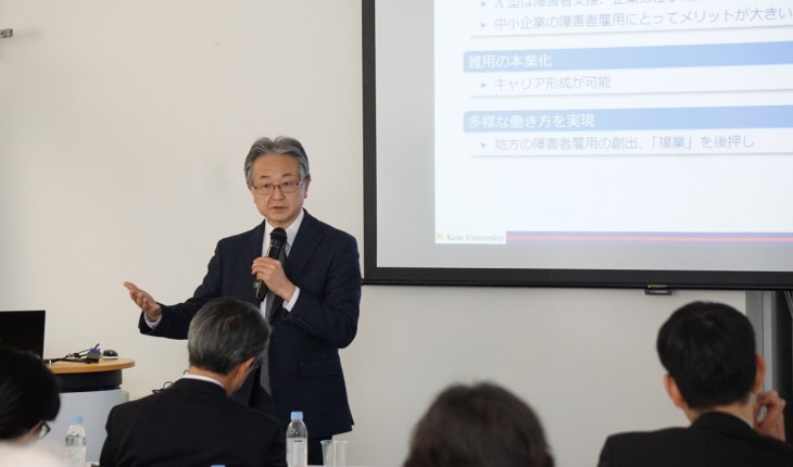 中島教授は、現行の障害者雇用促進法に基づく法定雇用率の算定基礎となる関連統計の不備や数値目標による雇用推進の限界について指摘。また、障害者雇用の主流となっている「特例子会社」の運営上の課題などを解説し、「みなし雇用」の導入などより柔軟な制度の運用について提言を行いました。