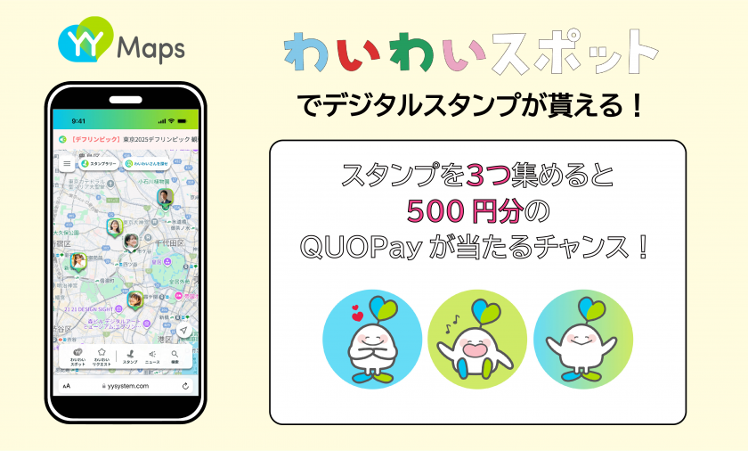 目玉となるのが、新アプリ「YYMaps」。これは、YYSystemが設置されている“わいわいスポット”を地図上で可視化するアプリで、交通機関・美容院・雑貨店・サウナ・ホテルなど、多様な場所で利用できます。期間中は100か所以上に設置され、スタンプラリーに参加してスタンプを3つ集めるとQUO Payが当たるキャンペーンも12月7日(日)まで実施されます。また、設置希望や改善アイデアを投稿できる「わいわいリクエスト」機能も備え、ユーザー参加型のイベントとして楽しめます。