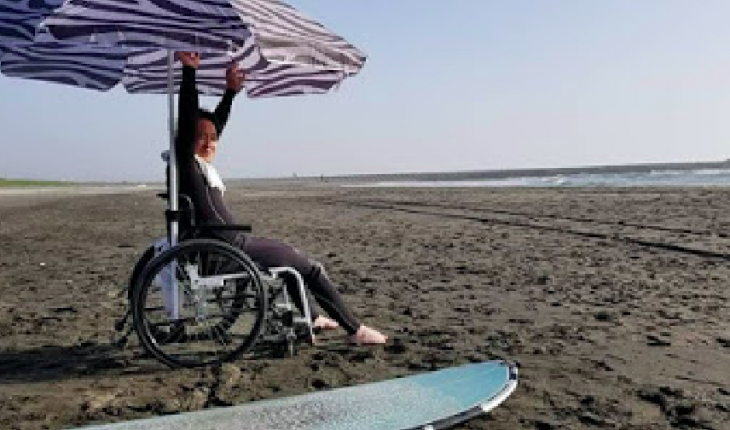 そして浜辺へ向かう。アパートから直線距離で300mくらいか。早くやりたいと、ワクワクしながら車椅子で向かうのも束の間、砂浜では車輪が埋まる埋まる。で回らない。もちろん後輩や仲間が手伝ってくれたが、とにかく、蜂蜜の中を泳ぐような気分だ。