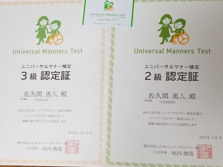 以前に受講したユニバーサルマナー3級・2級の認定票が届いた。