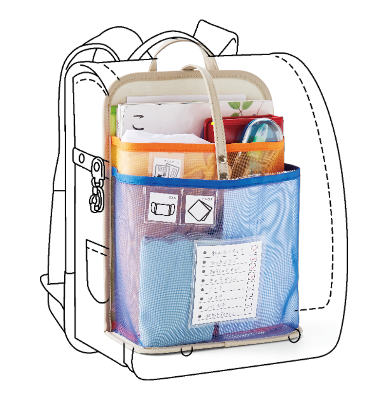 かねてより要望の多かったランドセル用のインナーです。中身が透けて見えるメッシュ素材の仕切りがついており、ランドセルに仕込むことで荷物を分かりやすく整理しつつ中がぐちゃぐちゃになるのを防ぎます。アイコンカードや持ち物チェックシートも同梱しており、忘れ物対策もバッチリです。