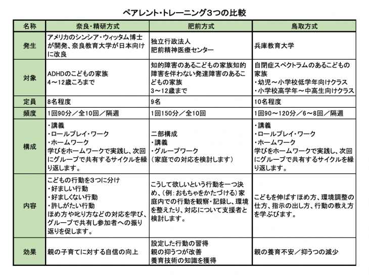 ペアレント・トレーニングは、自治体/病院/児童相談所などの児童施設/学校などの教育機関でも実施されています。いろんな種類がありますが、今回は主流の奈良・精研方式、肥前方式、鳥取大学方式の3つを比較しました。