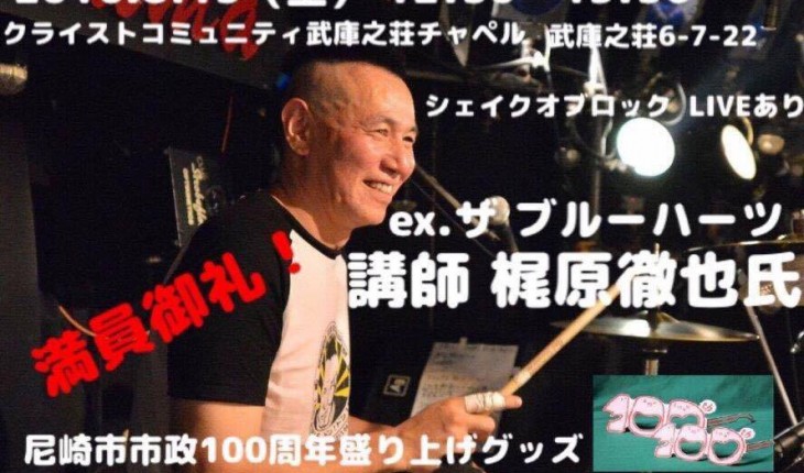 元ザ・ブルーハーツのドラマー、梶原徹也さんを講師に迎えて行います。尼崎市政100周年ロゴデザイナー北側利彦さんも100周年盛り上げグッズでゲスト出演!そして、尼崎バリアフリーロックバンド「シェイクオブロックwith梶原徹也」の演奏もあります♫