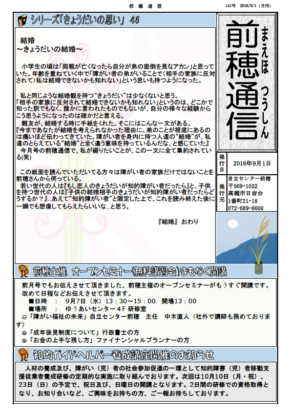 その過程を「自立センター前穂」さんは月間通信物「前穂通信」として、発信されておられます。その号数はなんと141号!(平成28年9月現在)ぜひ、興味を持たれた方は、ご覧いただければと思います。