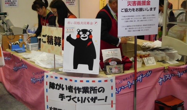 会場では大阪府内の障がい者施設商品のバザーも行われています。熊本地震への災害義援金も募っています。
