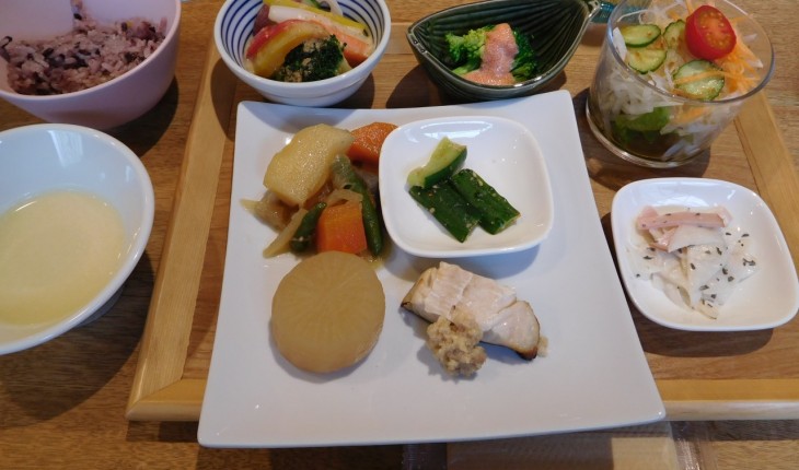 赤、水色、青、緑、黄色、白まで、優しくも鮮やかな陶器やガラスの器に盛られた野菜からお肉、パン、ご飯、スープ、ドリンクバー。虹のように並ぶ発酵食を眺め、香りを感じるだけでも、心が優しい気持ちと共にワクワクしてきます。ビュッフェなので、色々なメニューを味わってみました。透明なグラスに盛られたサラダには、食べやすいように小さく細切りにされた新鮮なキャベツと人参、大根、プチトマト。しゃりしゃりなのに柔らかな大根からは、大根本来の甘みを感じました。辛味や苦味は一切なかったので、野菜の苦手な人や子どもでも食べられそうです。他にも、にんじんのタラコ和えやかぶとナスのマリネ等は、味付けがしっかりしながらも、野菜の新鮮なうま味をしっかり引き出していました。メニューには、彩りの発酵野菜から、懐かしい味がするほっこり肉じゃが、あっさりしながらも肉のうま味が口の中に広がる煮込みハンバーグ等、子ども向けのメニューまで、種類はかなり豊富です。最後には、スイーツ好きにはたまらないヘルシーなデザートもいただきました。甘粕のガトーショコラやチョコチップ入りのバナナのパウンドケーキは、ちょうど良い甘さ加減に、しっとりとふわふわの絶妙なバランスを楽しめました。