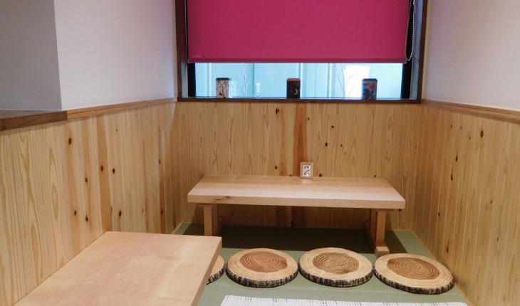 ログハウス風の一戸建て。店内に入ってみると、温かな憩いの空間が目の前に広がっていました。「いらっしゃいませ」、と微笑む店員さん。少々照れくさそうな笑顔からは、お客様に安心と憩いを与えたい、という真心を感じました。優しいオレンジの照明に包まれた店内。木の優しい香りを微かに漂わせる、木製のテーブルとお揃いの椅子。しかし、淡い色の家具の中で存在感を放つ赤と水色の鮮やかな椅子も。友人同士から子連れの親子まで、安心して楽しめる空間になっています。