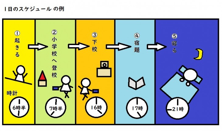 ・一日のスケジュール表やイラストカード、〇×のチェックリスト、時計・タイマーを活用します。項目は本人の特性に応じて考えますが、時間帯・活動内容・必要道具等に、分かりやすくイラストを描くと分かりやすいです。スケジュール表やチェックリストは、本人の目に留まりやすい場所を決めて貼ります。人・子どもによっては、表や図にあまり多くのことを書き込むと、どこを見たらいいのか混乱します。その場合は、なるべく短くシンプルなデザインにし、気が散らないように部屋はモノを片づけて整理整頓しておきます。