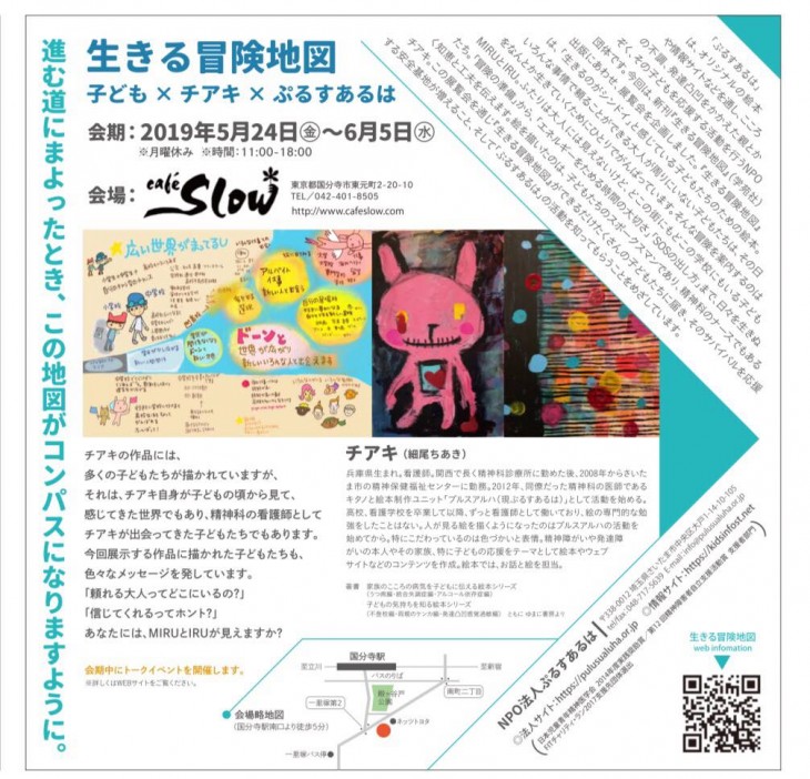 オリジナルの絵本や情報サイト制作を通して、精神障害や疾患を抱える子どもや家庭を応援するNPO法人「ぷるすあるは」。新刊となる「生きる冒険地図」の出版に合わせ展覧会を開催する運びとなりました。