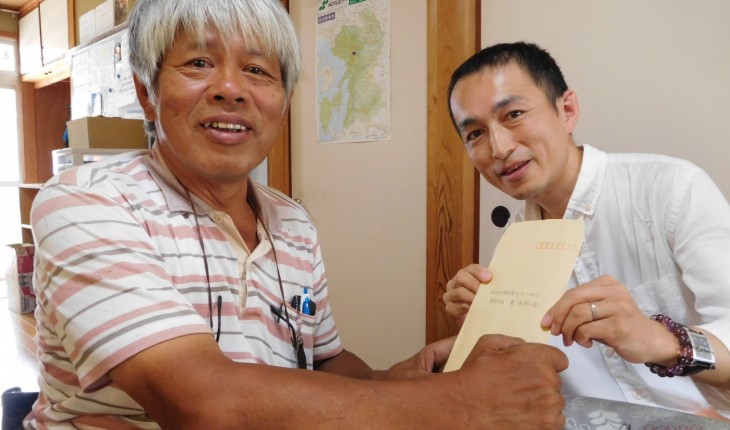 被災地障害者センターくまもと事務局長の東俊裕さん(左)に義援金を手渡しました。