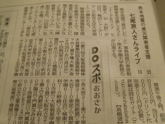 朝日新聞に掲載されました〜熊本地震被災障害者支援トーク&ライブ 七尾旅人in大阪