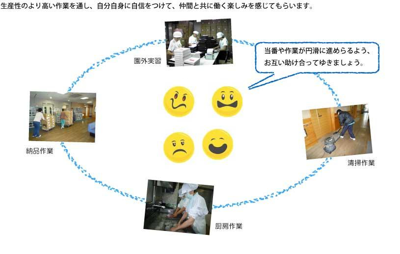 京都市やましな学園は、障害者総合支援法に基づき通所している知的障がいをお持ちの方に、生活支援、生産活動及び作業訓練を行うとともに、就労促進その他知的障がい者の自立支援のために必要な事業を行い、社会的な自立を図ることを目的とします。