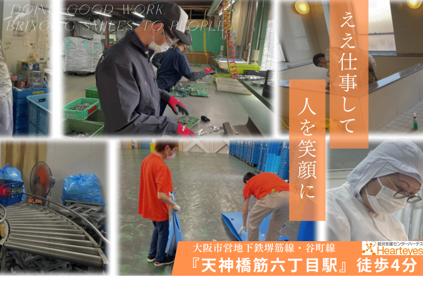 大阪・北区エリアの就労継続支援A型事業所「ハーテス」です。【天神橋筋六丁目駅から徒歩4分!】アクセス抜群です☆「ええ仕事して、人を笑顔に」をモットーに障がいのある方の自立を応援します。「一人ではまだ自信が無いけど、いつか社会復帰したい」という方、ハーテスでは、親身な支援であなたに合ったお仕事を一緒に見つけます。月に1度のカウンセリングなど、メンタルケアも充実☆まずはお気軽にご連絡下さい。