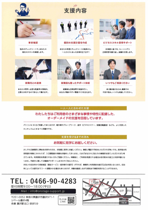 わたしたちはご利用者のさまざまな事情や特性に配慮した、オーダーメイドの支援を目指しています。パソコンは30台ご用意してありますが、軽作業やグループワーク、座学(ビジネスマナー、就職活動講座)なども、より充実したカリキュラムにするべく研鑽中です。