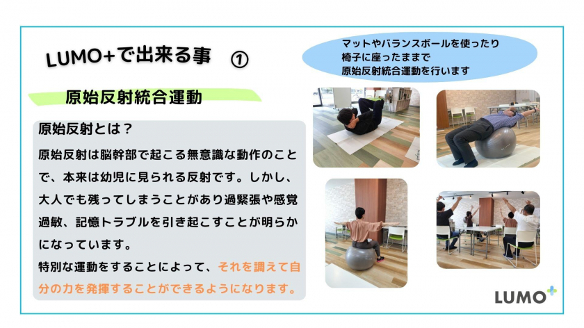LUMO+は、原始反射統合プログラムを基に、400以上あるコンテンツや独自の自己理解プログラムで、一人ひとりの伸ばしたいことを自分のペースで学ぶことができる「できるを増やす」就労支援施設です。